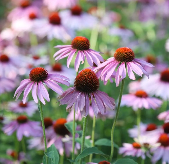 Эхинацея узколистная достигает высоты 60–70 см и украшена розовыми цветками. Она обладает стержневыми корнями и прямостоячим стеблем, который ветвится в верхней части, образуя длинные цветоносы с соцветиями-корзинками. Это растение предпочитает солнечные места и хорошо переносит засуху и зимние морозы, что делает его идеальным для массовых посадок в цветниках природного стиля.