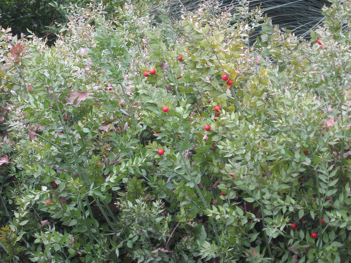 Иглица Понтийская (Ruscus aculeatus) – это вечнозеленый полукустарник или многолетник с мощным, густоветвящимся корневищем. В природе высота этого растения не превышает 100 см, что делает его компактным и привлекательным в любое время года. Иглица Понтийская выглядит как густооблиственный кустарник, хотя настоящие листья у нее очень мелкие и почти незаметные, развивающиеся под землей. Над землей они представлены в виде легко опадающих белых чешуек. Уникальной особенностью этого растения являются филлокладии – видоизмененные побеги, которые внешне напоминают обычные листья. Эти плоские, овальные или эллиптические побеги с заостренным кончиком создают иллюзию густой облиственности.