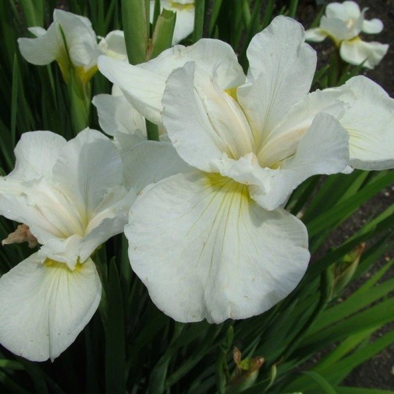 Ирис Snow Queen достигает высоты до 65 см, а диаметр его соцветий составляет около 8-10 см. Основной цвет цветков - белый, но у основания нижних лепестков появляется насыщенный желтый оттенок. Крепкие зеленые листья сохраняют свою декоративность на протяжении всего периода вегетации.