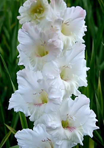 Гладиолус "Лебединое Озеро" представляет собой элегантный сорт с двухрядными, чисто-белыми цветками, украшенными изящной гофрировкой и малиновым пятнышком в центре. Этот сорт отличается мощными, высокими и пышными цветами с плотной текстурой лепестков. Гладиолус "Лебединое Озеро" прекрасно растет и идеально подходит для срезки. Период цветения составляет 85-90 дней, а диаметр цветка достигает гигантских размеров - 14 см и более. Высота растения достигает 145 см.