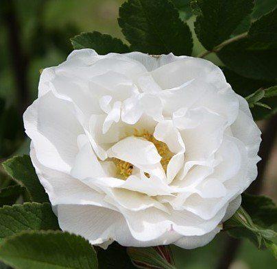 Роза канадская парковая Лак Маджеу – это великолепное растение с белыми, средне-махровыми цветками, которые в бутоне имеют легкий розовый оттенок. В полном роспуске цветки раскрывают серединку с яркими желтыми тычинками. После цветения на кусте появляются декоративные красные ягоды. Листва у этой розы средне-зеленая, матовая и кожистая. Роза цветет один раз за сезон. Размер цветка составляет 5-6 см, а высота куста достигает 120-150 см. На одном стебле может быть от 3 до 5 цветков. Зона морозостойкости – 2 (до -45.5 °C), что делает этот сорт чрезвычайно устойчивым к холодам.